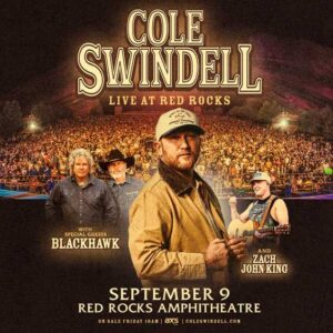 Cole Swindell performs at Red Rocks with BlackHawk and Zach John King. Expect a polished country show with radio hits and a big summer-night crowd.